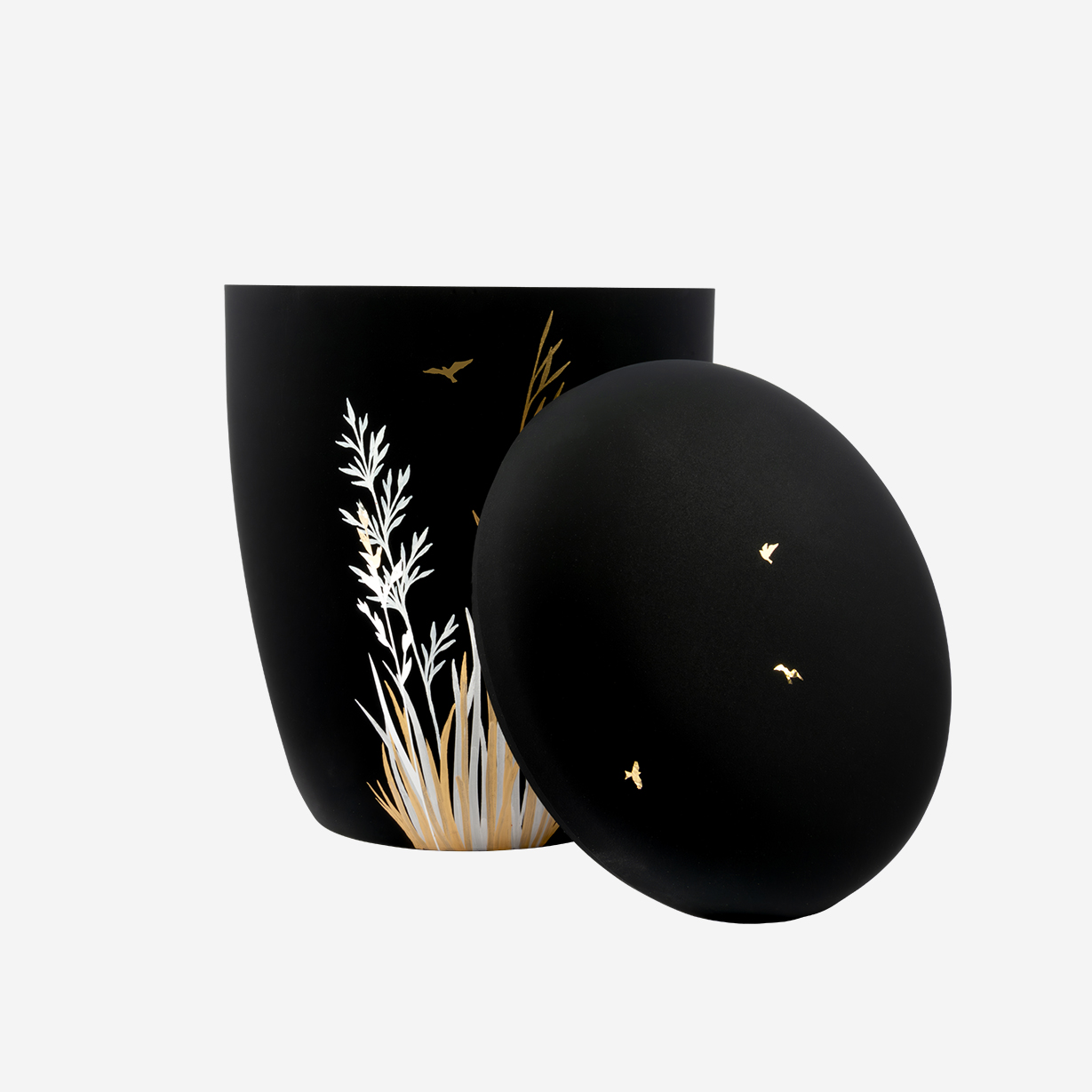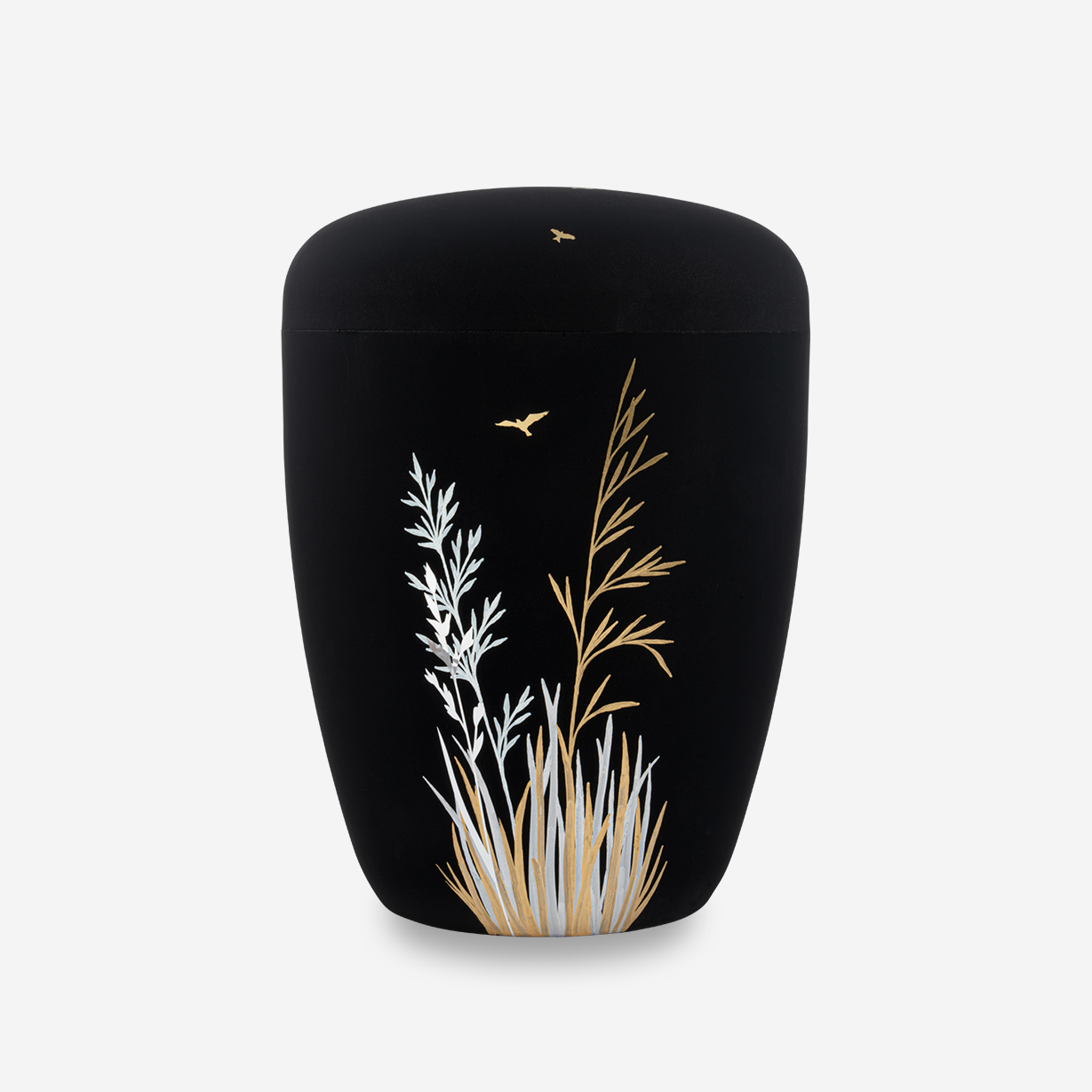 Bio Urne schwarz-matt lackiert, von Hand bemalt.