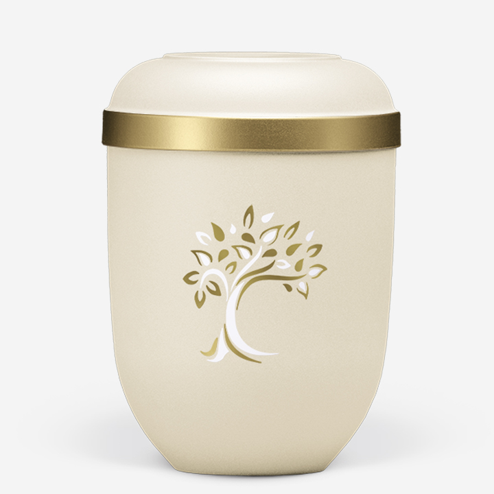 Naturstoffurne, Hell Beige Velours, Baum ART-Dekor gold/weiß